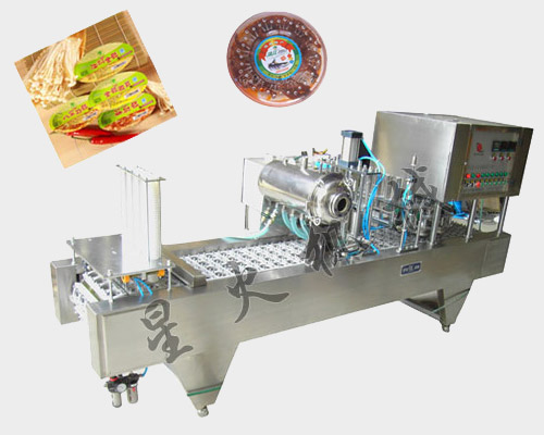 整機通過自動裝置將海產品充填入塑料盒裝內,然后通過抽真空裝置將盒內進行抽真空操作,然后利用光電裝置進行盒子定位,很后進行產品的封口操作,整個操作完成。