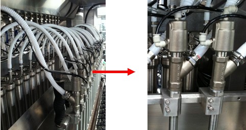 4、氣缸帶動灌裝頭運行的下潛灌裝方式,配合可設定的變速灌裝功能,可降低易起泡物料在灌裝時泡沫的產(chǎn)生,防止物料外溢造成的瓶口污染。同時將灌裝頭下潛的氣缸動作機構(gòu)移到積液水盤的下方,防止外濺物料對氣缸等零件的腐蝕,目前只有我公司采用這種專li機構(gòu)。