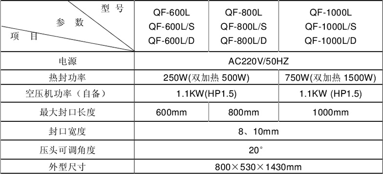 F系列氣動塑料薄膜大袋封口機適用于袋長600mm,800mm,1000mm的各種塑料薄膜袋的封口,該機采用電氣和氣動控制,根據包裝袋不同的材質和厚度,選擇適當的熱封電壓,熱封時間和氣壓,適用于單層厚度不超過0.10mm的塑料袋或紙塑復合袋、特殊需求,可選用雙加熱的機型(即在袋口兩側加熱)可熱合單層膜厚度不超過0.20mm的塑料袋,該機可以和各種生產流水線配套使用。