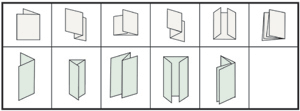 原理及特點: DZ系列自動折紙機設計先進、制造精良、可用于設計范圍內各種不同尺寸和厚薄紙張的折疊、可折成圖例所示六種式樣。調整簡便,送紙流暢,無級調速,輕巧高效。